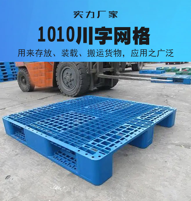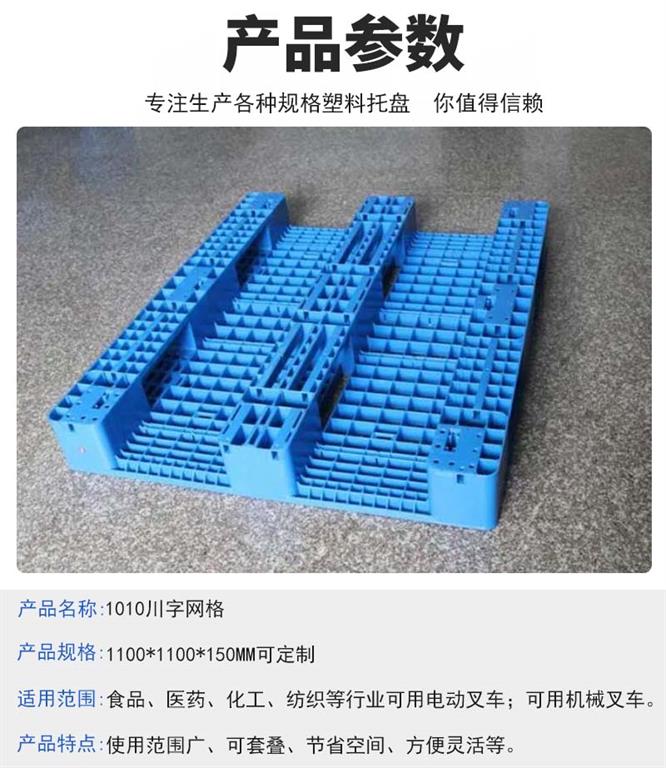 1010川字網格塑料托盤是川字型塑料托盤的一種,此款塑料托盤的表面是網格狀,托盤的底部形狀為漢字\'川\'字狀,顧稱為川字網格塑料托盤,在使用上有煙草塑料托盤、化工塑料托盤、食品塑料托盤等很多類型,川字網格塑料托盤應用行業用范圍適用于化工、石化、食品、飼料、制衣、制鞋、電子、電器、港口、碼頭、餐飲、生物醫藥、機械五金、石油化工、立體倉儲、物流運輸、儲存貨架,汽菊配件、啤酒飲料、紡織印刷、印刷包裝等各有于業。