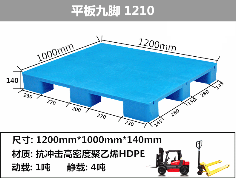 1210九腳平板塑料托盤的尺寸:1200*1000*150 mm,