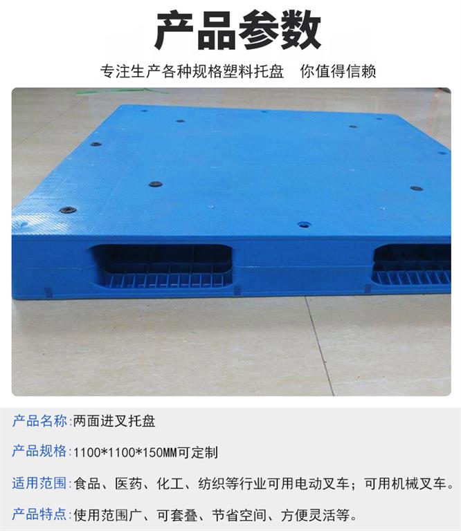 兩面進叉托盤是一種與叉車、貨架等物流設備配套使用的物流單元。可用來存放、裝載、搬運貨物,是現代化物流倉儲中不可少的物流設備之一。塑料托盤的出現是適應環保需要,使用塑料托盤代替木托盤可減少對森林破壞;是適應物流業發展的必然產物,隨著食品安全觀念的不斷強化,行業衛生性的高要求,塑料托盤以其防腐、防潮濕、防銹蝕、抗蟲蛀、不發霉等特點受到食品行業的青睞和追捧。此外,塑料托盤的承載性能高和使用壽命長等特點,在化工、輕紡、制造業等領域有著普遍的應用。
