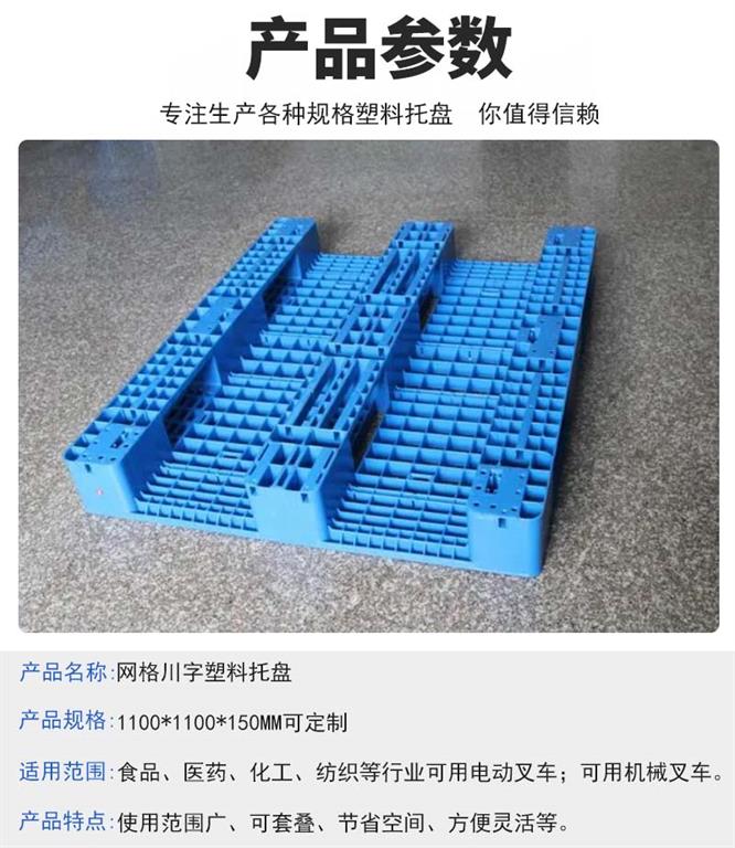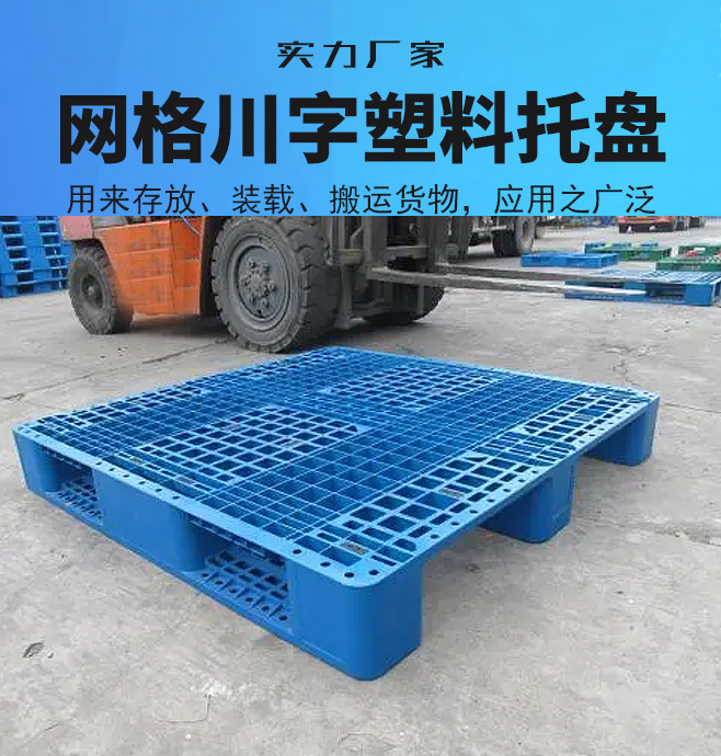 網格川字塑料托盤分類:1、單面塑料托盤只能一面使用,表面有網格狀和平板狀兩種,底部有川字型、田字型或九只方墊腳型、根據承載量和使用場合的不同分為貨架系列、標準系列和較輕系列三種標準。